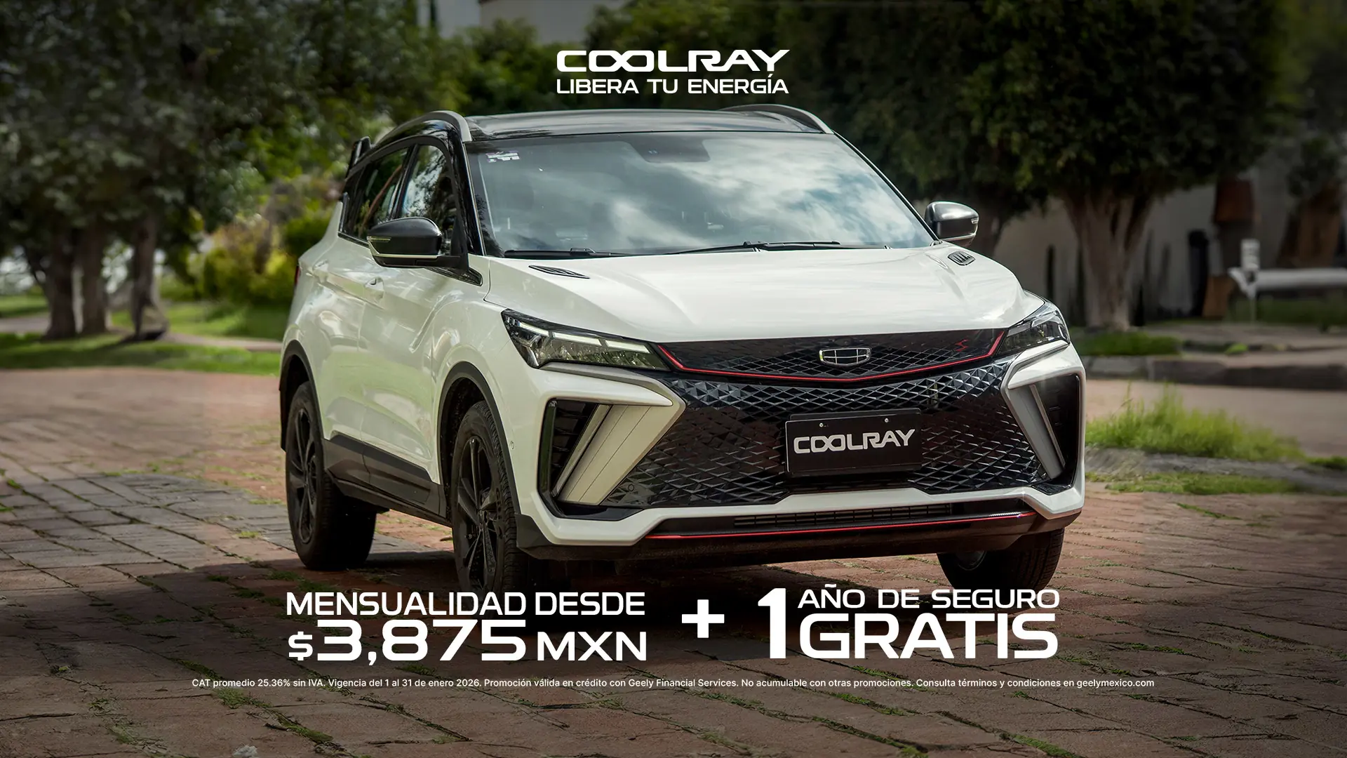 La mensualidad desde $3,875.00 MXN aplica únicamente con el plan de crédito simple, a través de Geely Financial Services (BBVA México S.A., Institución de Banca Múltiple), para el modelo Coolray 2026 en su versión GC, con un enganche desde 51.5%, sobre un importe promedio a financiar de $215,595.10 MXN a un plazo promedio de 72 meses y tasa de interés ordinaria fija anual sin IVA del 7.15%. Usando el bono de $25,900 sin IVA, para subsidio a tasa.  Esta oferta incluye el costo del seguro gratis por un año, conforme a lo estipulado en su contrato, y no es acumulable con otras promociones. Aplica 2.5% de comisión por apertura en plan BASE